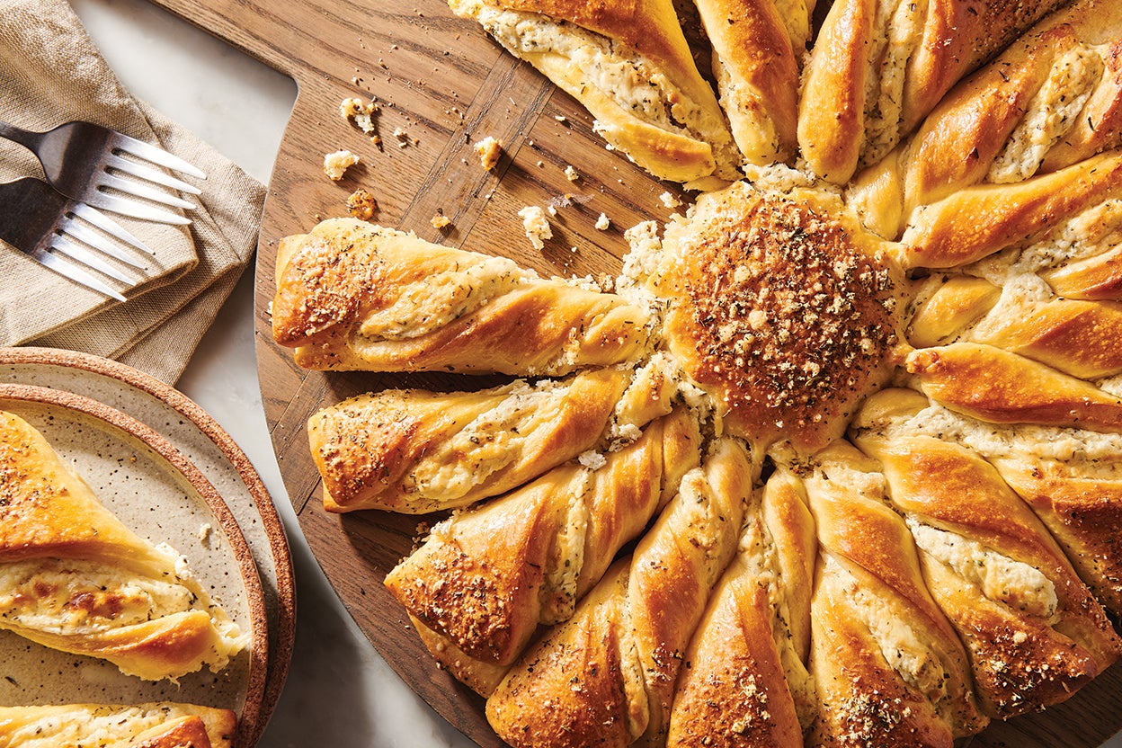 Remove the cutter from the center of the dough, and transfer the dough, parchment and all, to a baking sheet. Next, gently tug each strip away from the center, then twist 3 or 4 times in the same direction.
