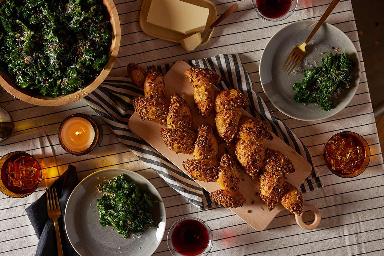 To add the seed crust: Moisten a kitchen towel and place it on the bare half of the baking sheet. Place the top side of the shaped dough onto the moistened towel, then set the moistened top on the seeds and roll to coat it. For the most thorough coating, let the loaf sit in the seeds for 5 to 10 seconds after rolling. Carefully place the loaf on the cornmeal-sprinkled parchment.